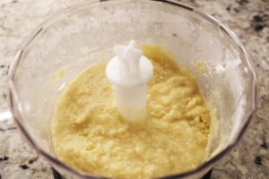 - Add 3/4 cup blanched almonds to a food processor and blitz until nice and fine.