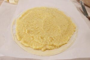 - Place one round on the sheet pan lined with parchment paper and spread the almond paste on top, leaving about a 3/4" gap from the edges.