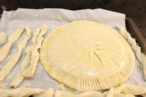 - Using the tines of a fork, seal the edges of the pastry. Sprinkle the top of the pastry with powdered sugar, then paste with egg wash using the 2nd egg. Roll the cut off pieces into a ball then roll out to a 1/4" sheet and cut 1" widths. Twist and set next to the pastry.