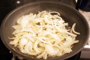 - Peel and slice one medium onion and add to the spices. Add grated garlic and ginger and cook until the onions become soft, about 5-6 minutes.