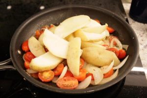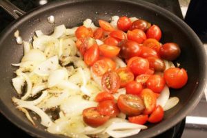 - Slice 8-10 cherry tomatoes in half and add to onions and cook until the tomatoes become soft, but still hold their shape, about 5 minutes.