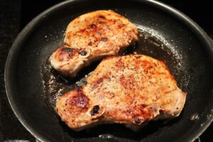 - Heat 2 tbsp canola oil in a large skillet over medium high heat. Cook chops for about 3 minutes per side, or until the chops have turned a deep brown. Remove chops to a plate and set aside.