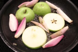 - Peel and slice 3 medium shallots in half, keeping the root end intact and slice each of the 2 medium Granny Smith or Gala apples into 4 slices through the equator.