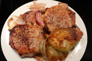 - Add shallots and apples to the skillet used for the chops. Gently press down to create contact with the pan. Cook until golden brown, then turn and cook the second side, about 3-4 minutes per side.