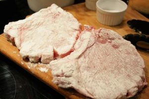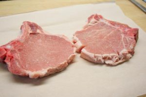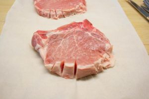 - Cover chops with parchment paper, and using the flat side of a meat mallet, pound each pork chop to about half of its original thickness.