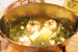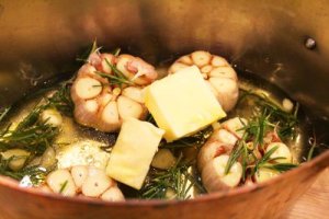 - Cut a 1/4” slice of garlic from the top of each head of garlic, then place garlic, cut end up, in a small roasting dish and top with butter and olive oil.