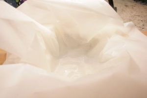 - Cut 3 sheets of parchment paper making sure that the sheets are large enough to line the pan and still have a 2-3" overhang.