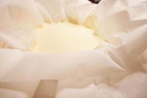 The charm of this Basque Cheese cake is its rugged, ragged look. This includes the scorched parchment paper and the almost burned top of the cheese cake. I think that it is beautiful and I actually served the cake with the paper in tact. I didn’t, but you could sprinkle it with a bit of powdered sugar to amplify the affect.