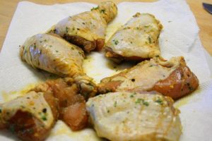 - Remove the chicken pieces from the marinade to a paper towel lined plate and pat dry.
