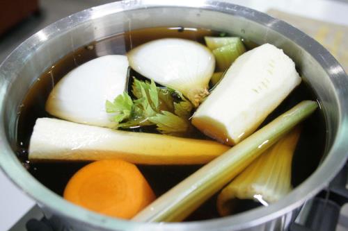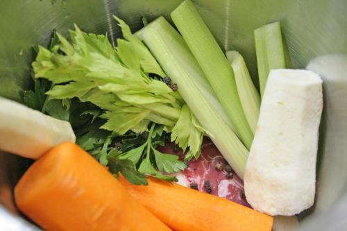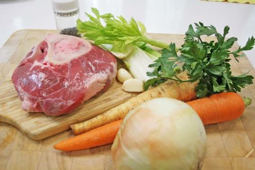 - Place beef shank in the bottom of a soup pot, top with celery, sliced carrot, parsnip, bunch of parsley, onion, pepper corns, garlic cloves.