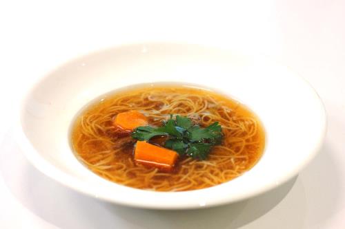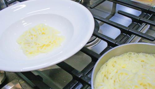 - When the pasta is cooked, add a little cold water to stop the cooking and place a small mound in the center of a soup bowl.