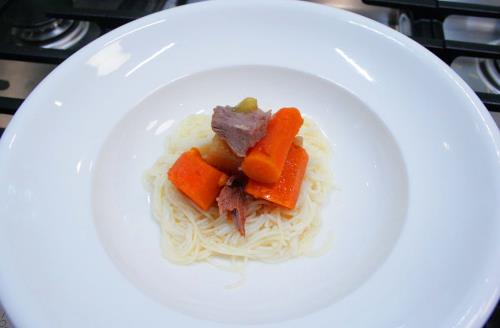 - When the soup is done and the beef shank is tender, remove the beef shank and cut/shred the beef into small bite sized pieces, strain the soup and reserve carrots, parsnips and celery and cut into chunks and break angel hair pasta into 2-3 inch lengths.