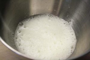 - While the cake is baking, whip the 2 remaining egg whites until frothy.
