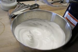 - Gradually add 1/2 cup sugar until the mixture forms stiff peaks.