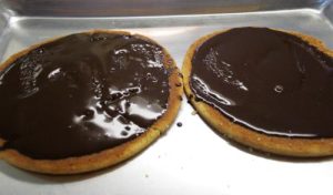 - After an hour, spread another thin layer of ganache on each cake and cool for another 30 minutes.