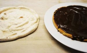 - Allow the ganache filling to cool, 4-5 minutes, and then spread an even thin layer on each cake round while still on the baking sheet. Transfer to your refrigerator and cool for about an hour.