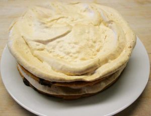 - Top the meringue with the second cake round and the second meringue layer as the top layer.