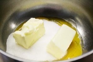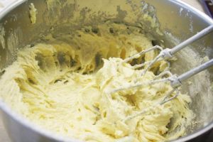- Add egg yolks, sugar and butter to a medium sized mixing bowl and beat until light and fluffy, about 5-6 minutes.
