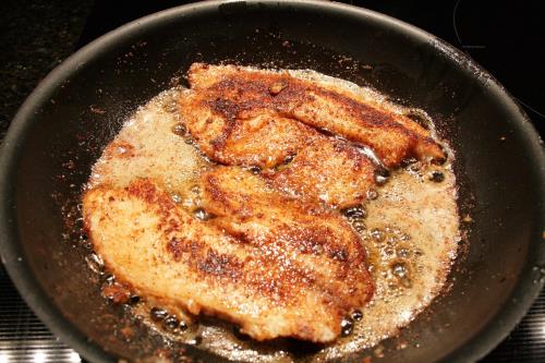 - Place tilapia fillets in the frying pan and fry each side for 2-3 minutes. Check before turning, the fish should be nicely browned and should have a bit of a crust. When the first side is done, fry the second side for another 2-3 minutes.