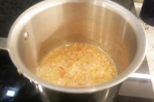 - Melt 1 1/2 tbsp unsalted butter in a medium sized saucepan over medium heat. Add 6 whole shallots, chopped and sweat the shallots until they are soft. About 5 minutes under a covered lid on medium heat.