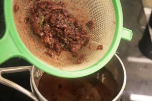 - Strain the sauce into a small saucepan and press the solids in the sieve to extract as much of the vegetables as you can. Scrape the outside of the sieve into the sauce. This will give the sauce a bit more body. Taste and season with kosher salt and freshly ground black pepper.