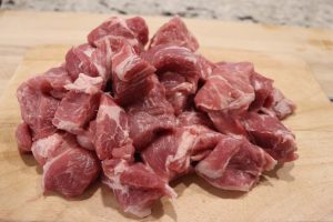 - Cube 2 1/2 lbs pork shoulder and set aside.