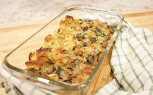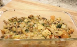 - Spray a loaf pan with vegetable spray and transfer stuffing to pan.