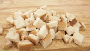 - Cut 2 hard rolls or 3 slices white bread into 1" cubes and set aside.