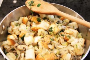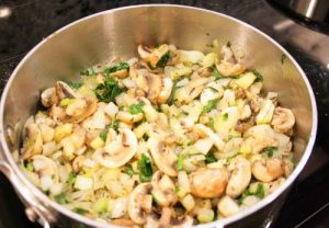 - Heat 1 tbsp oil in a frying pan over medium high heat and add onion and celery and sauté until the onion becomes translucent, about 5-8 minutes, then add the mushrooms, 1/2 bunch parsley chopped, 1 1/2 tsp kosher salt, 1 tbsp sage leaves and 1 tsp ground black pepper . Combine, allowing the mushrooms to let out liquid and begin to soften.