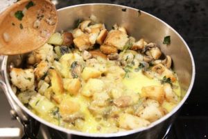 - Beat 1 large egg with a fork until slightly frothy and mix well with cooled stuffing. Allow to sit for 5-10 minutes or until the bread has absorbed the egg.