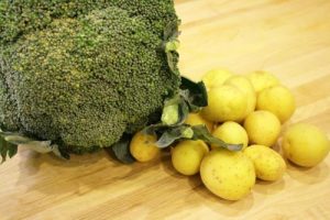 - Quarter 10-12 baby white potatoes and separate 2 stems of broccoli and chop the stems into 1" pieces.