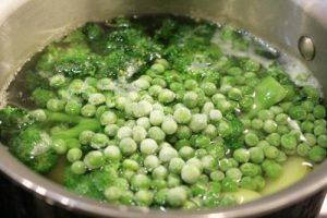 - Add 1 cup of frozen peas and bring to a boil. Season with kosher salt and freshly ground black pepper.