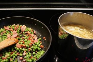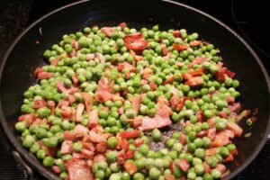 - Add 1 cup frozen peas and cook for 5-6 minutes or until the peas are heated through.