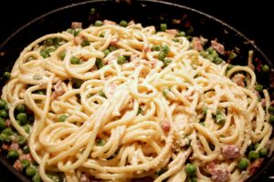 Bucatini with Sweet Peas, Ricotta and Smoked Ham, a perfect spring or summer pasta dinner. I made it using some ricotta cheese I bought for another recipe and the cheese was so good that I combined it with a few other ingredients and created this perfect light dinner.