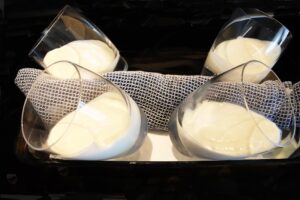 - Prepare glasses to tilt to a 45° angle in a baking dish supported by a rolled tea towel. You will fill these glasses part of the way with the buttermilk cream mixture. Make sure that the glasses are tilted as you are filling them and stop just short of the pouring to the top rim.