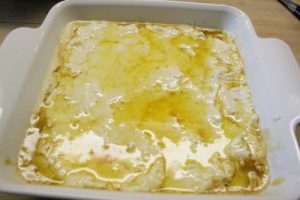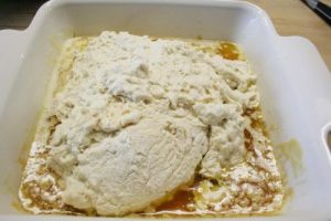 - Transfer the mixture to the prepared baking dish and spread evenly with the back of a spoon. The butter and honey mixture will rise and run over the biscuit dough.