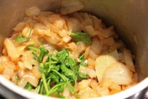 - When the onions begin to brown, reduce heat to medium and add 2 sprigs parsley, 1 sprig fresh rosemary, 2 whole bay leaves and stir to combine, cook for another 3 minutes.