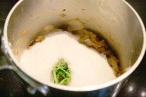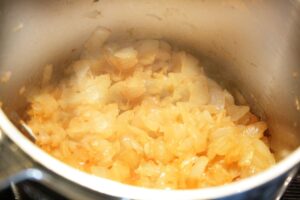 - Add 2 whole yellow onions chopped and stir to combine. Cook for about 15 minutes, stirring once or twice.