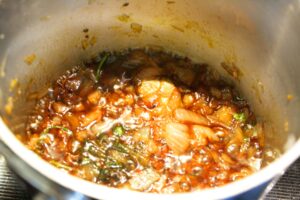 - Stir to combine, increase heat to medium high and cook until the mixture becomes a deep amber color, about 6-8 minutes.