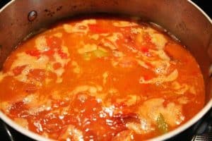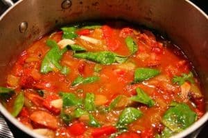 I love Cataplana. This Portuguese Seafood Gumbo is filled with delicious seafood, so let your imagination guide you. It also calls for Portuguese smoked sausage called linguiça. If you cannot find linguiça sausage feel free to substitute another such as Andouille sausage, which I did and it was just right. It added a bit of heat, which I think that this dish needs, and the broth is sensational. Perfect for dunking that crunchy baguette or roll.