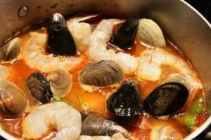 - Increase heat to medium high and add shrimp, clams and mussels to the mixture. Cook for 4 to 6 minutes or until the shrimp has turned pink and the shell fish have opened.