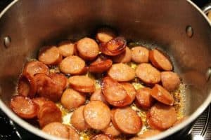 - Slice 1/2 lb Andouille sausage, linguiça sausage or Polish sausage into 1/4" slices.