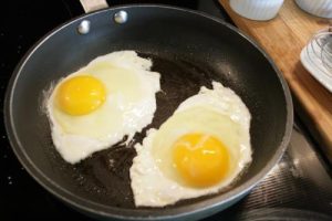 - Add one whole egg at a time and cook until the egg whites set, but the yolks are still runny, about 3-4 minutes.
