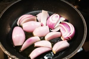 - Heat 1 tbsp olive oil in a medium skillet over medium high heat and add 3 medium shallots peeled and halved, cut side down and season with kosher salt.