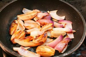 - Cook shallots, undisturbed until the shallots are beginning to char underneath, about 5 minutes.