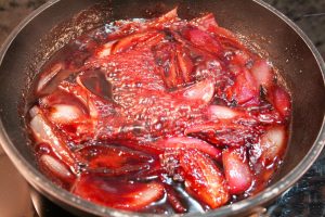 - Add reserved vinegar mixture and 1 cup fresh (or frozen) pitted sweet cherries to the cooked shallots and bring to a fast simmer for about 5 - 6 minutes.