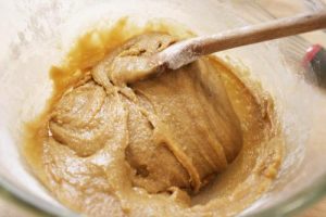 - Add brown sugar, vanilla and almond extract to the cooled butter and stir until the mixture is smooth.