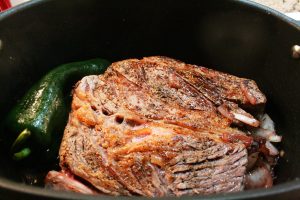 - Return the seared beef to the pan and place it on top of the vegetables. Add enough beef stock to come up about 2/3 of the way, but do not cover the beef.