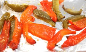 - When you are on the final 30 minutes of cooking the beef, place 1 red bell pepper and 1 green bell pepper, seeded and sliced on an aluminum lined cookie sheet. Drizzle with 1 tbsp olive oil and season with kosher salt and freshly ground black pepper.