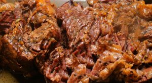 - Once the beef is done, remove to a baking sheet and allow to cool slightly. Using two forks, shred the beef as you would pulled pork.